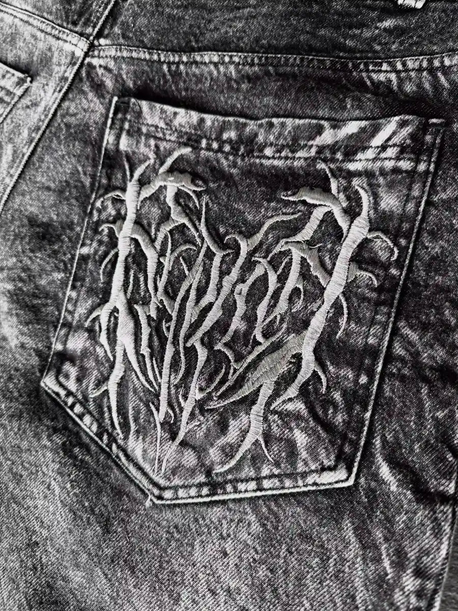Embroidery: Front and back embroidery covering the entire leg