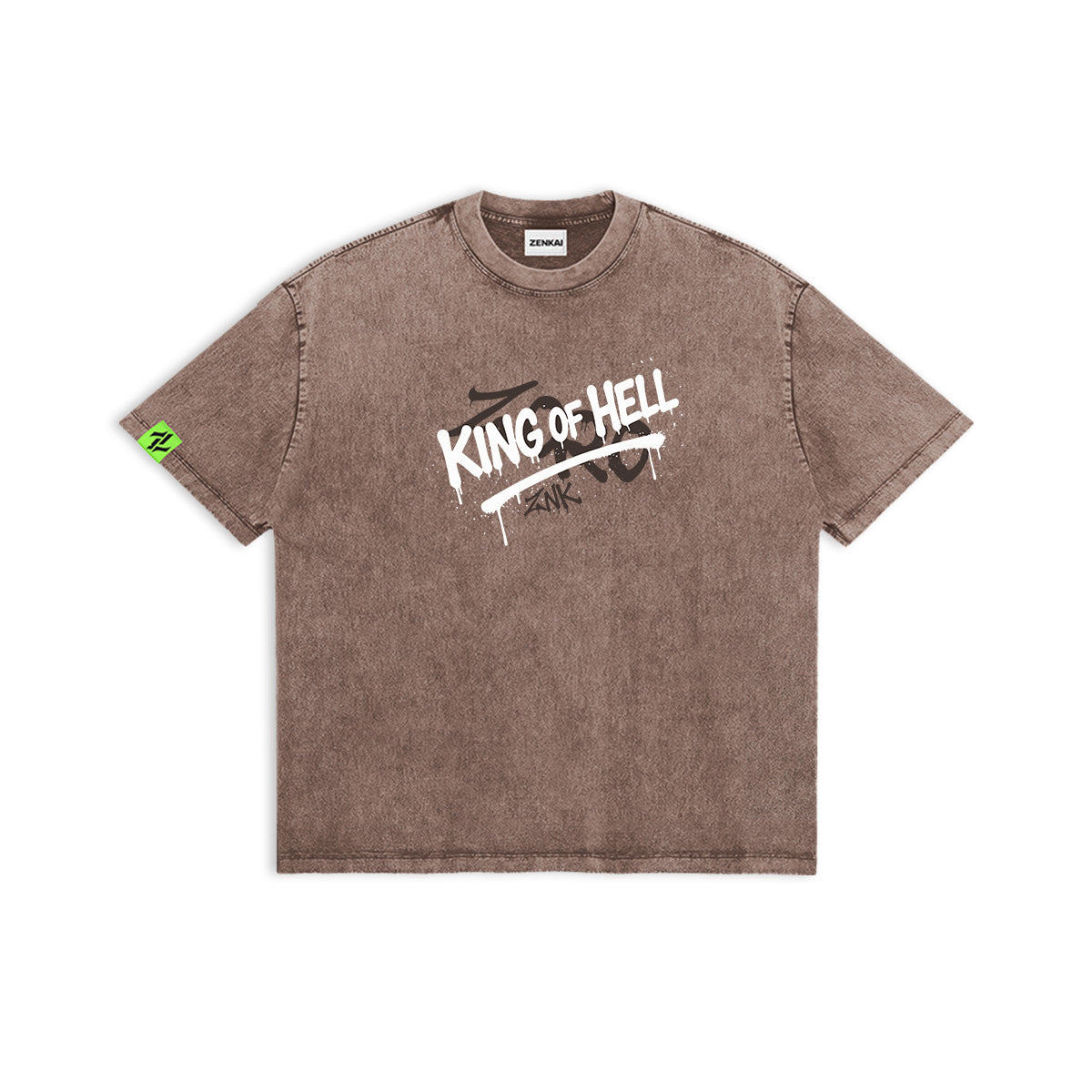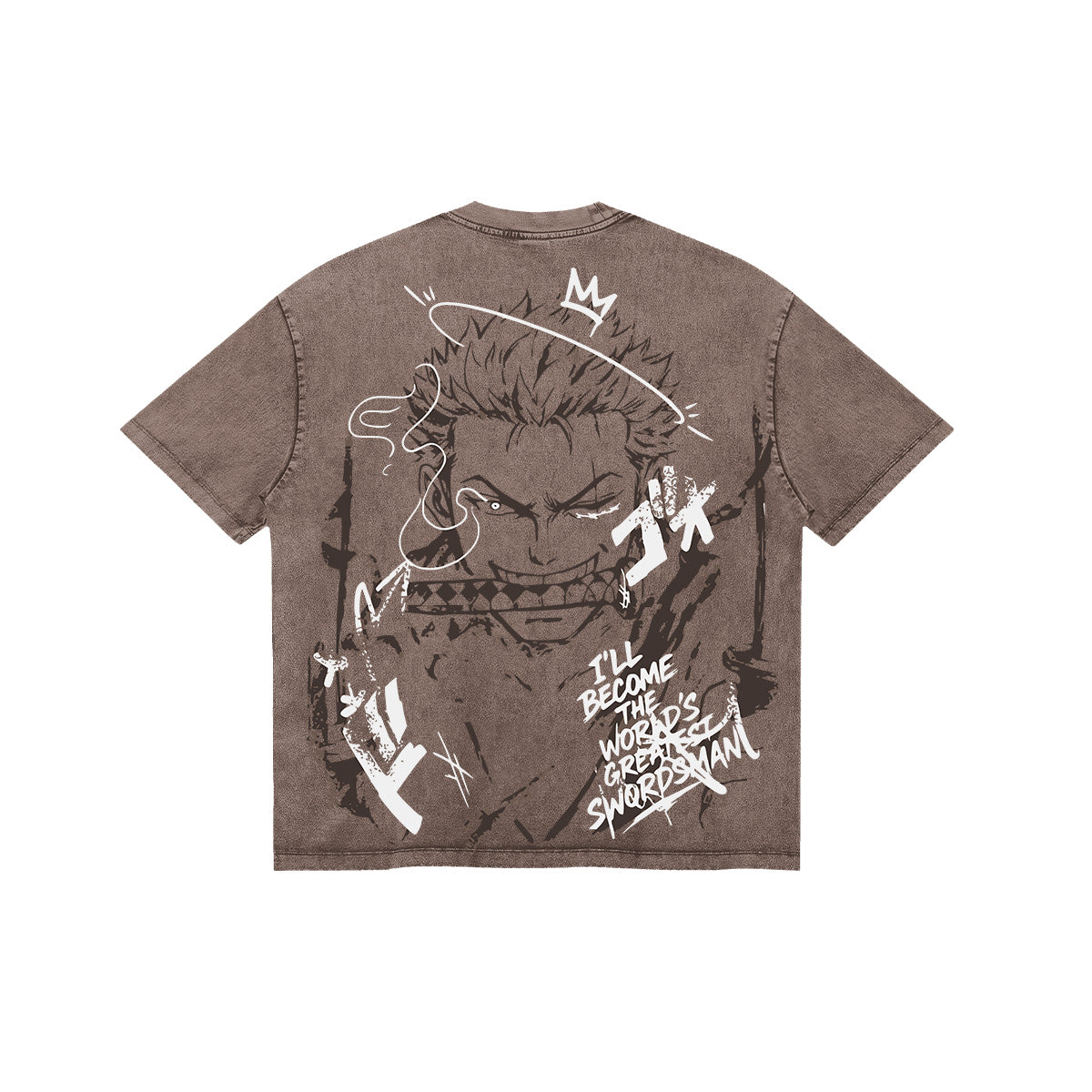 I’ll become the World’s Greatest Swordsman! A raw and aggressive tribute to Roronoa Zoro’s ascension. The front of this chocolate-brown washed tee features a bold, spray-painted "KING OF HELL" tag, dripping with the defiant energy of Enma’s master. The back reveals a gritty, sketch-style portrait of Zoro, his teeth bared as he grips his katana, wreathed in chaotic white smoke and jagged onomatopoeia. Topped with a minimalist crown and his iconic vow, this design captures the moment a pirate becomes a legend. A premium, heavyweight essential for those who fear nothing—not even hell itself.