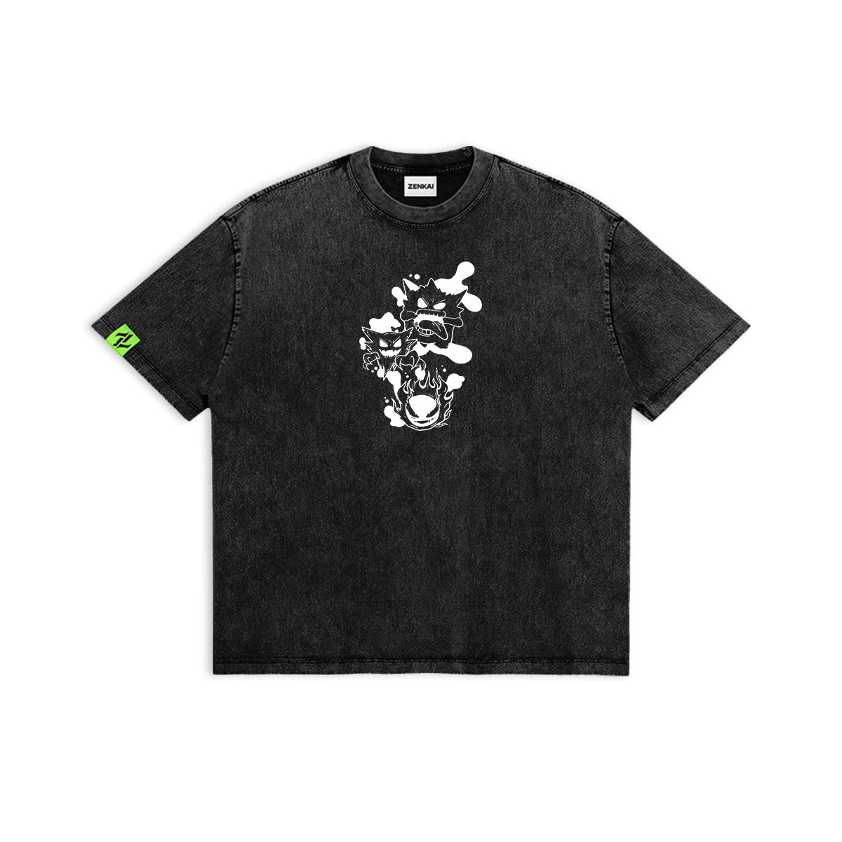 Beware the shadows. A chilling and artistic tribute to the most iconic Ghost-type. The front of this charcoal-washed tee features a minimalist, ink-splatter trio of Gastly, Haunter, and Gengar, emerging like spectral smoke. The back reveals a cinematic masterpiece: Gengar standing front and center under a massive, glowing full moon, flanked by his pre-evolutions amidst a dead, twisted forest. Captured in a high-contrast "black-and-white" aesthetic, this design leans into the eerie urban legends of the Pokémon world. A definitive essential for those who aren't afraid of the dark.