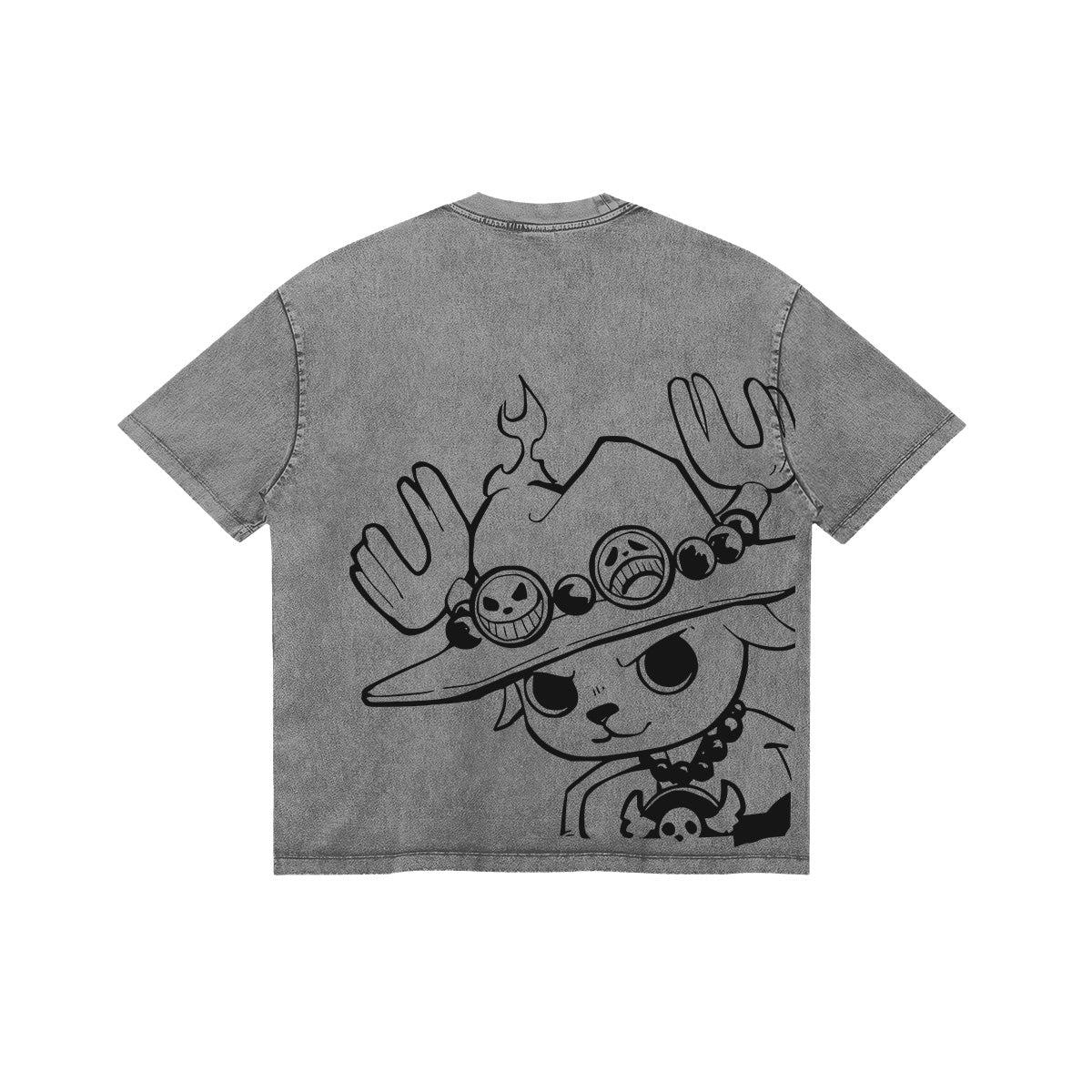Carry the fire forward. A charming yet powerful tribute to the Straw Hat’s brave doctor. The front of this slate-grey washed tee features a minimalist, fine-line sketch of Chopper wearing Ace’s iconic orange hat. The back reveals a massive, close-up manga illustration of Chopper, his eyes filled with determination as he dons the signature headwear of the Flame-Flame Fruit user. Rendered in a clean, high-contrast ink style, this design embodies the bond of brotherhood and the "Inherited Will" that defines the world of One Piece. A premium essential for those who believe that a person only truly dies when they are forgotten.