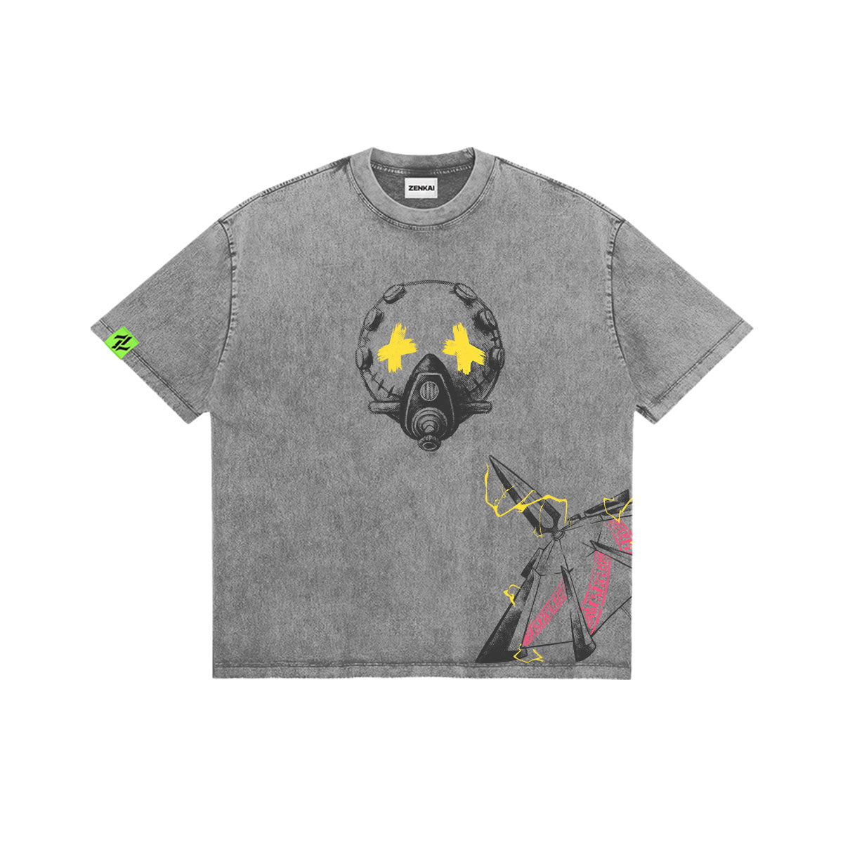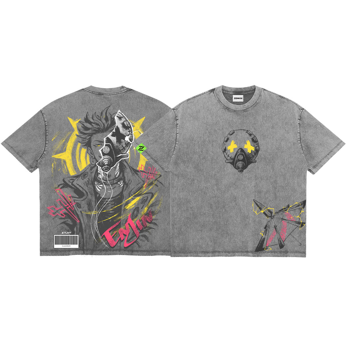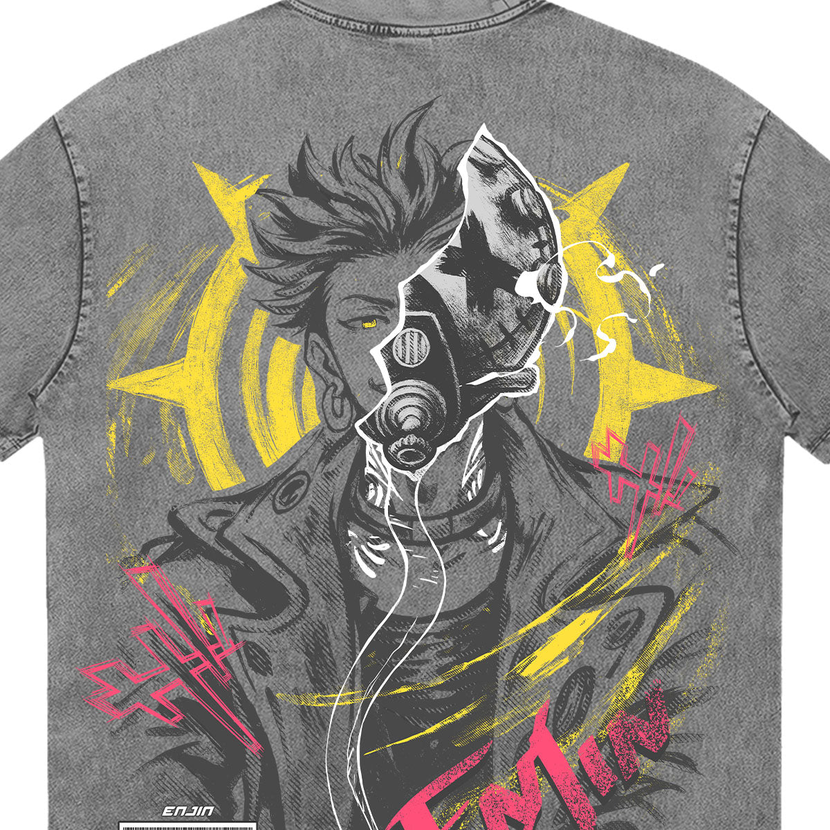 Artifact Specialist. A rugged and stylish tribute to Enjin, the man who showed Rudo the true power of "Givens." The front of this mineral-washed tee features his signature crossed-out eye mask, while the back showcases a high-energy portrait of Enjin himself. The design is saturated with vibrant yellow and hot pink accents, reflecting his bold personality and the chaotic beauty of his combat style. With its industrial aesthetic and graffiti-inspired details, this piece is a must-have for those who see the hidden potential in everything and value the bond between a mentor and a student.
