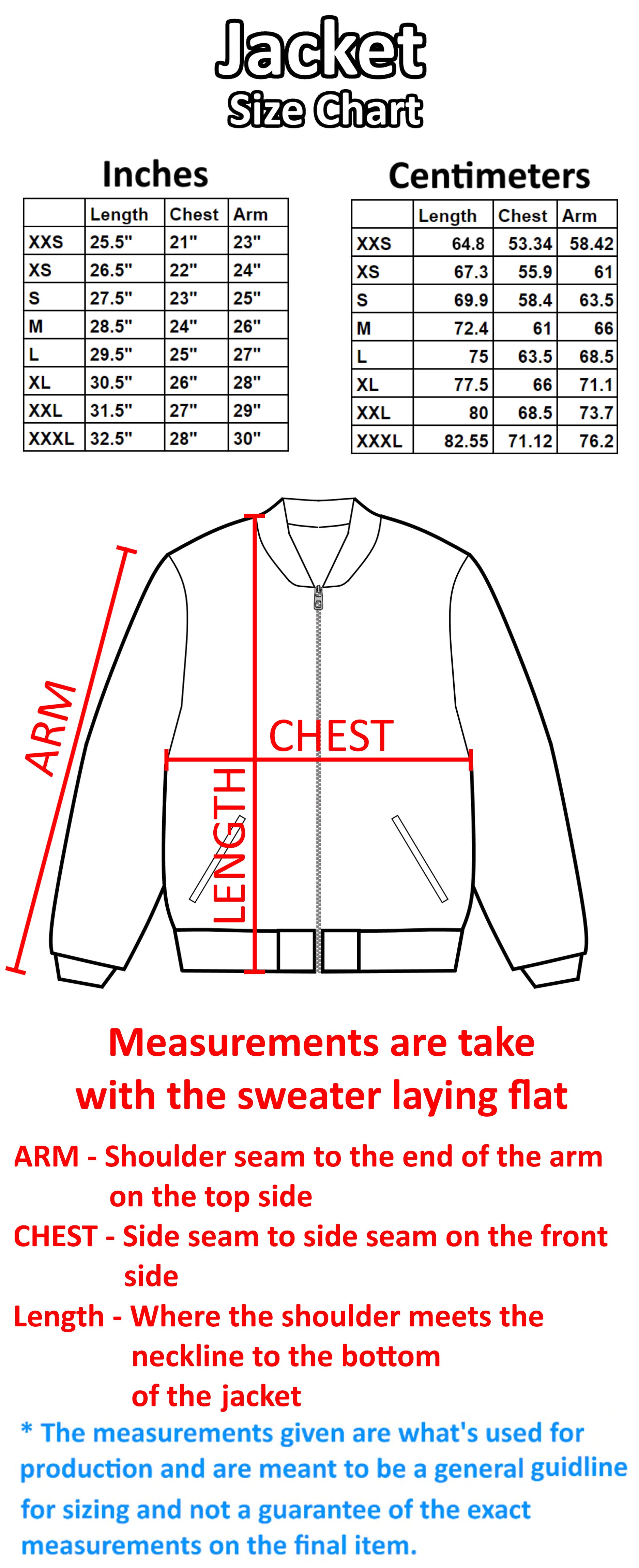 • Jackets use the same measurements for production as our sweatshirts and hoodies. Whatever size you fit best in those items will be the same size for this. Just note that the jacket material is not as stretchy as the sweatshirt material.