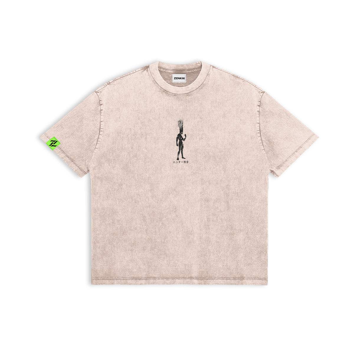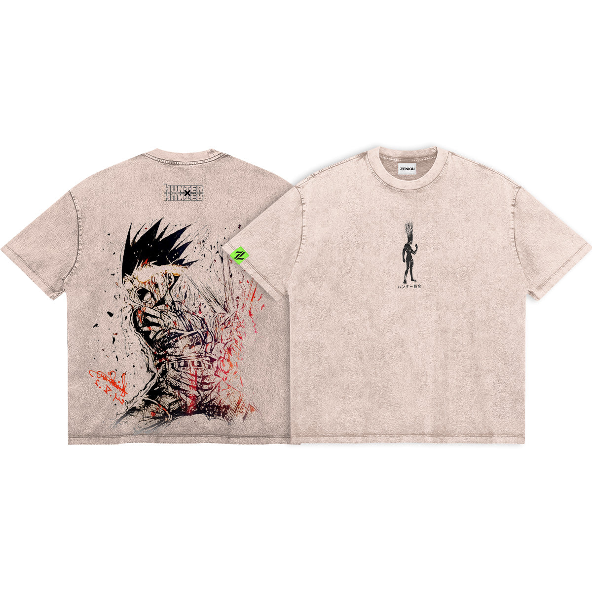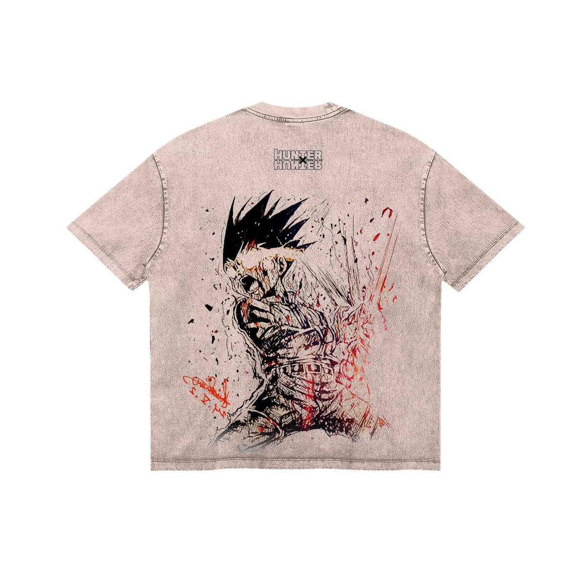 Give Everything for Revenge. A haunting and explosive tribute to Gon Freecss’s final transformation. This sand-beige washed tee captures the moment a boy discarded his future to obtain the power to destroy his enemy. The front features a minimalist, towering silhouette of Gon’s ascended form, a silent shadow of the sacrifice he made. The back is a visual eruption of Nen and rage, showcasing Gon in a raw, sketch-heavy style, with visceral red splatters that cut through the vintage fabric like the Nen pact itself. Framed by a distorted "HUNTER x HUNTER" logo and aggressive, jagged textures, this design captures the terrifying beauty of a soul pushed beyond its limits. A premium essential for those who understand that true power always comes with a price.