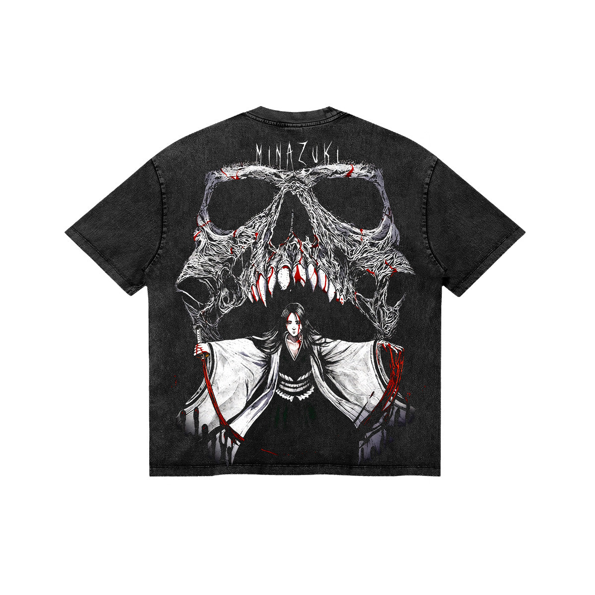 The edge of death. A chilling and visceral tribute to the woman who held the title of Kenpachi before Zaraki. The front of this charcoal-washed tee features a sharp, minimalist "BANKAI" typography in a jagged, hand-drawn style. The back reveals a haunting masterpiece: Unohana standing calmly beneath a colossal, skeletal maw dripping with blood—the manifestation of her Bankai, Minazuki. Captured in a high-contrast aesthetic with deep red accents, this design embodies the terrifying transition from healer to the most bloodthirsty criminal in the history of the Soul Society.