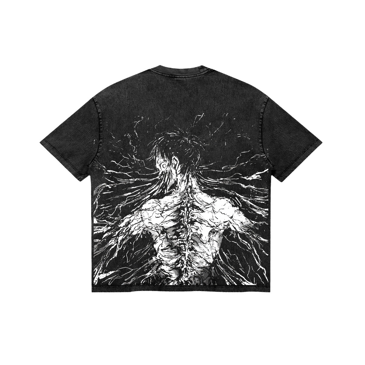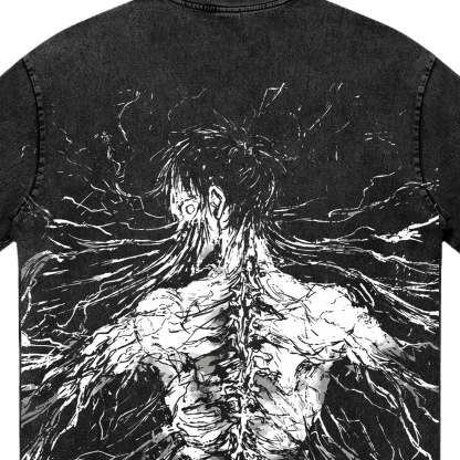 The Advancing Giant. A visceral and haunting tribute to Eren Yeager’s ultimate evolution. The front of this charcoal-washed tee features the sharp, minimalist Zenkai logo, a mark of those who push beyond their limits. The back reveals a stunning, high-contrast illustration of the Founding Titan's spine and muscular structure, captured in a raw, explosive ink-sketch style. The design embodies the sheer scale and terrifying power of the Rumbling, making it a definitive essential for those who choose their own path, no matter the cost.
