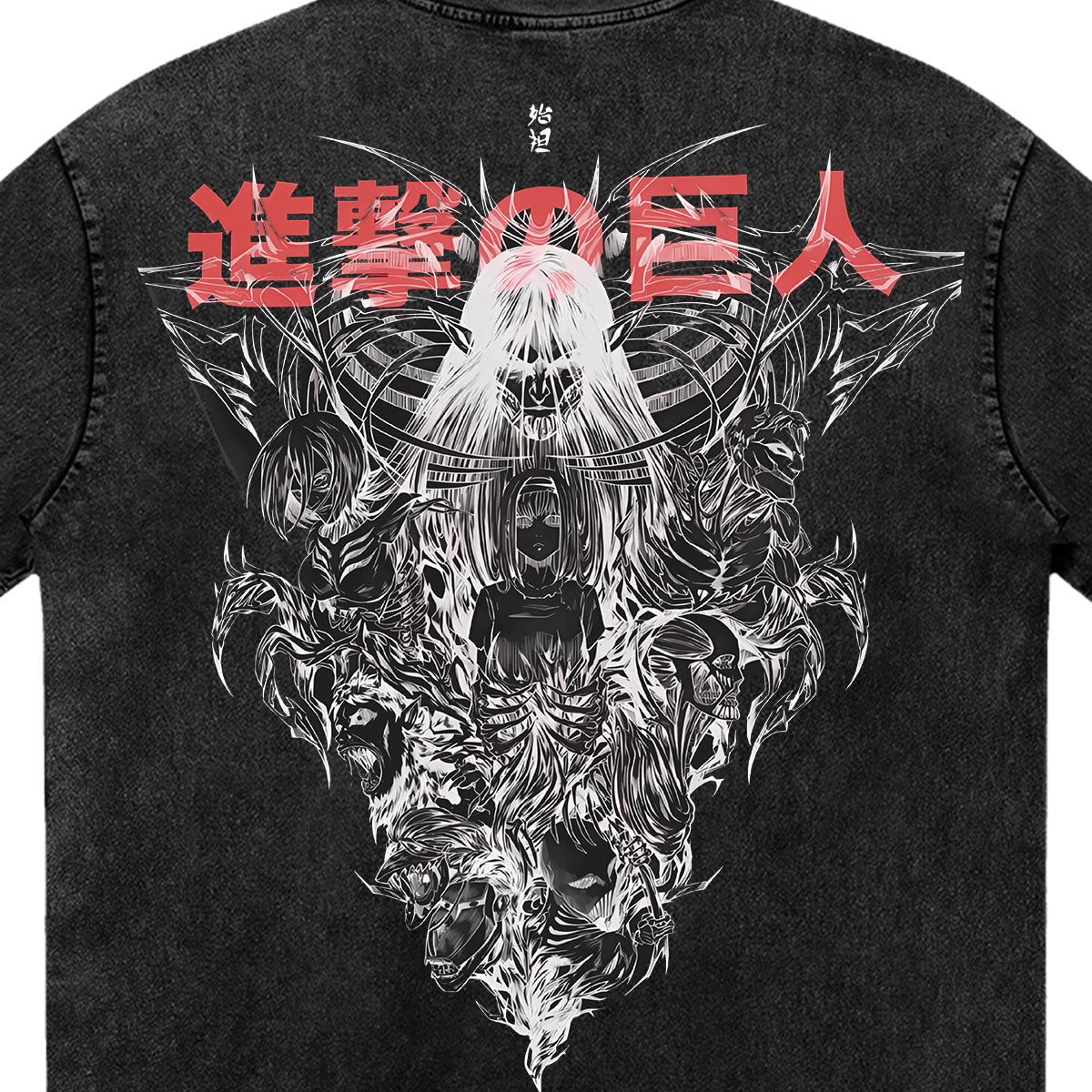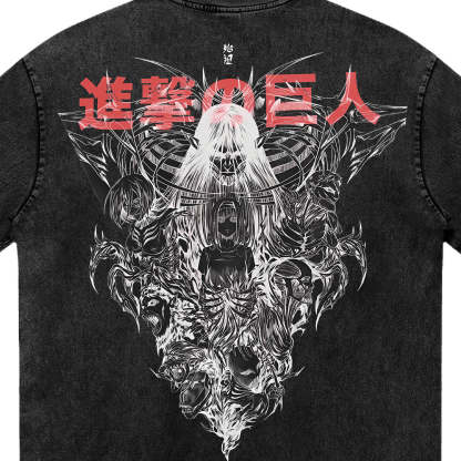 The End of the World. A haunting visual of the Founding Titan emerging from the chaos. This design captures the sheer scale of the ultimate destruction and the tragic inevitability of Freedom's cost. The intricate white linework creates a skeletal, ghostly aesthetic against the "Kuro" wash, serving as a grim monument to the final chapter of history.